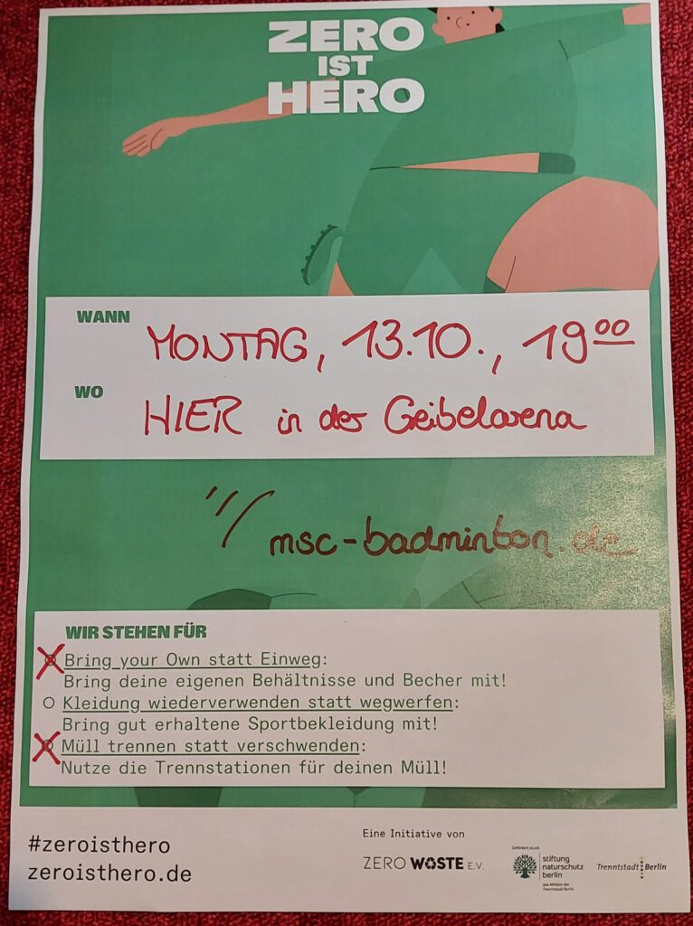 Am Montag, den 13. Oktober, werden wir einen abfallarmen Spieltag ausrichten, d.h. wir versuchen – mit Ausnahme der Bälle – möglichst wenig Müll zu hinterlassen, etwa beim Buffet. An diesem Abend haben unsere beiden Teams Heimspiele, wir erwarten also Gästeteams aus Weißensee und vom SC Brandenburg. Los geht’s um 19 Uhr – kommt gerne in unserer Geibelarena vorbei und macht mit!
